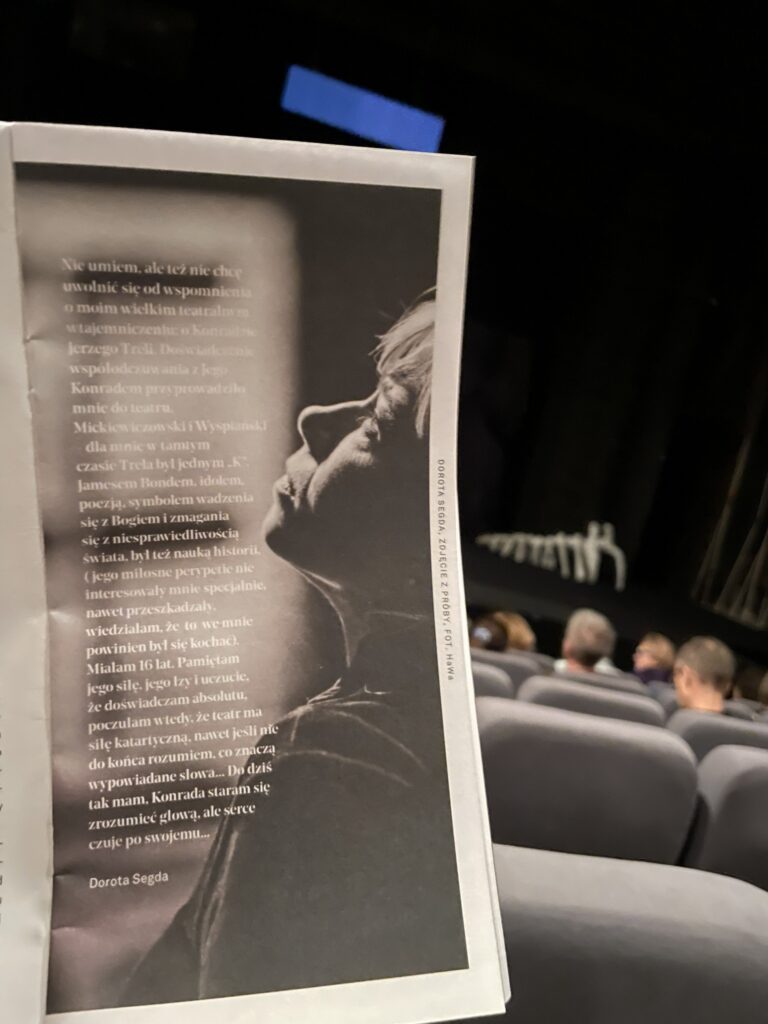 Trzy godziny męczenia publiczności, tylko po to, żeby dojechać do tej puenty. Chciałby się powiedzieć krakowskim aktorom: jeśli tyle czasu i energii poświęcacie na zapewnienia, że czemuś już nie chcecie ulegać, to właśnie znaczy że temu ulegliście, że wpadliście w pułapkę ideologii przed którą sami przestrzegacie. Zamiast ilustrować przeciągniętymi etiudami, że nie chcecie robić „Wyzwolenia” – po prostu go nie róbcie, wystawcie sobie jakiś inny tytuł. Przecież nikt wam niczego nie każe. Nawet PiS już was nie ciemięży, wszyscy wasi znajomi, a nawet urzędnicy którzy wami zarządzają, są zwolennikami rozmaitych partii postępu. Zrzucanie z ramion płaszcza Konrada Skamandryci ogłaszali ponad sto lat temu. Wyważacie dawno otwarte drzwi, nudzicie, marnujecie czas widzów takimi premierami poświęconymi oczywistym oczywistościom.