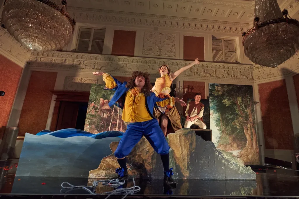 Spektakl, inicjujący cykl pod nazwą „Scena Dworska”, miał premierę w Łańcucie w sali balowej dawnej rezydencji Lubomirskich i Potockich. Środki teatralne zostały tu świadomie uproszczone, aby dostosować go do grania w zamkach i pałacach. Z żartobliwą i nostalgiczną nutką ogrywa się tutaj iluzjonistyczną maszynerię sceniczną i symboliczne dekoracje, tak jak dawne konwencje literackie, mieszczące w jednej obsadzie antyczne bóstwa z nisko- i wysoko urodzonymi śmiertelnikami.